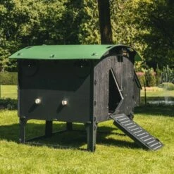 Fonctionnel, le Farmer possède de nombreux atouts dont deux ouvertures avec rampe d’accès et loquets de fermeture, des toits ouvrables pour accéder à l’intérieur facilement, trois perchoirs… Le pondoir est compartimenté en 2 nichoirs.