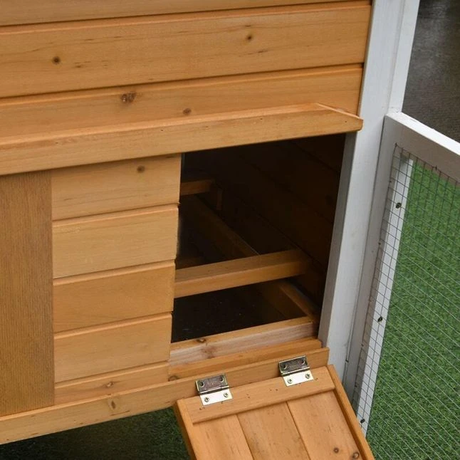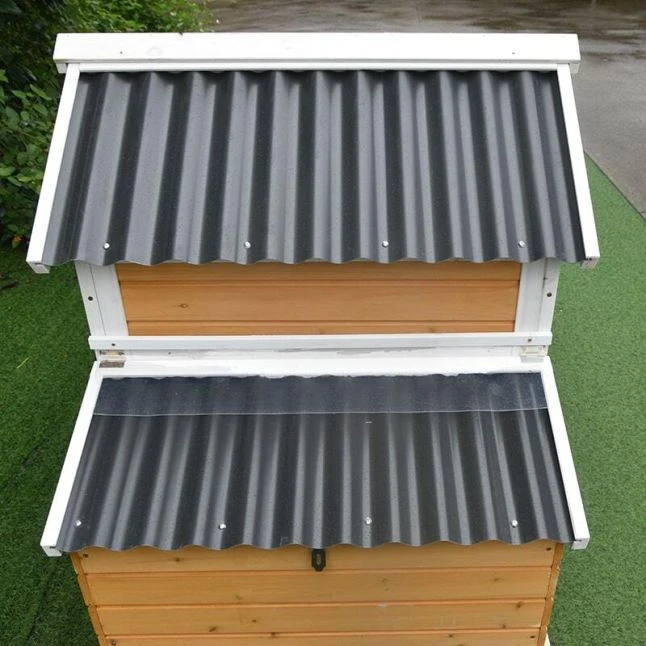Elles pourront s’installer sur les deux perchoirs et se relayer dans le pondoir séparé en deux pour pondre leurs œufs. La récolte sera simplifiée par la présence d’une toiture séparée placée sur le pondoir.