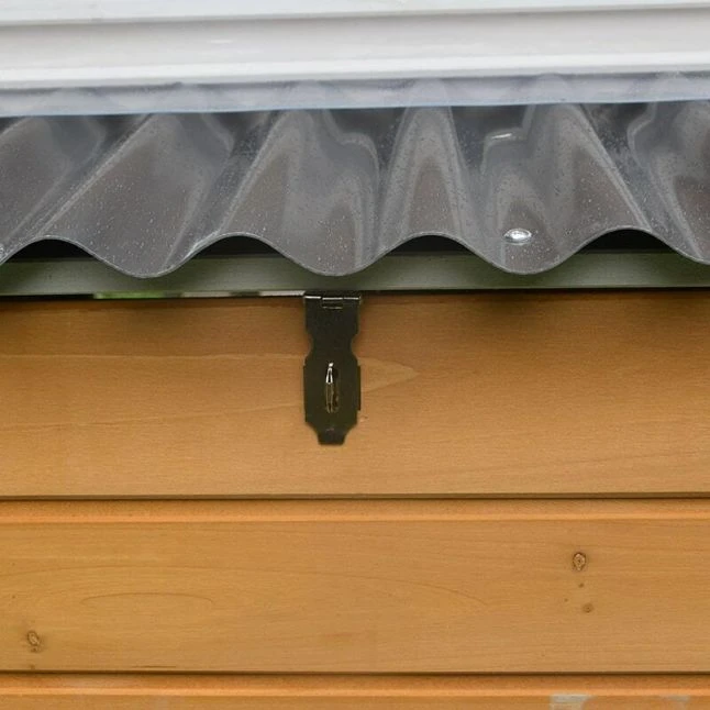 Votre abri en bois ne craindra pas la pluie puisqu’il est surmonté d’une toiture en forme de double pente en plastique ondulé, matériau solide et totalement étanche.